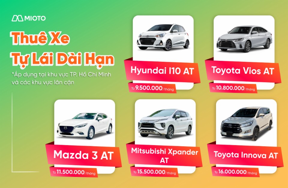 Mioto kết nối khách hàng có nhu cầu thuê xe với hàng ngàn chủ xe ô tô ở TPHCM, Hà Nội & các tỉnh thành khác. Mioto hướng đến việc xây dựng cộng đồng người dùng ô tô văn minh & uy tín tại Việt Nam.